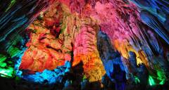 白龍洞發(fā)育于距今2.25億年的三疊紀白去質(zhì)石灰?guī)r,溶洞內(nèi)千奇百怪的石筍、石花、石柱、石幔、石簾等均是由于水和二氧化碳的緩慢侵蝕和積聚創(chuàng)造出來的杰作,漸漸形成了這千姿百態(tài)、光怪陸離的洞內(nèi)奇觀。